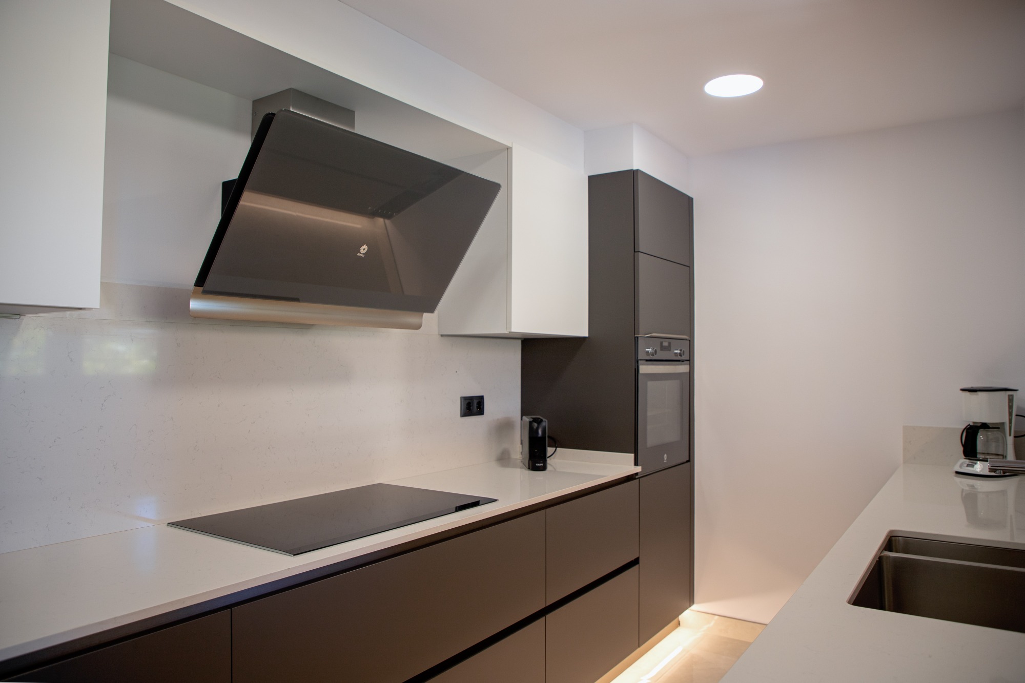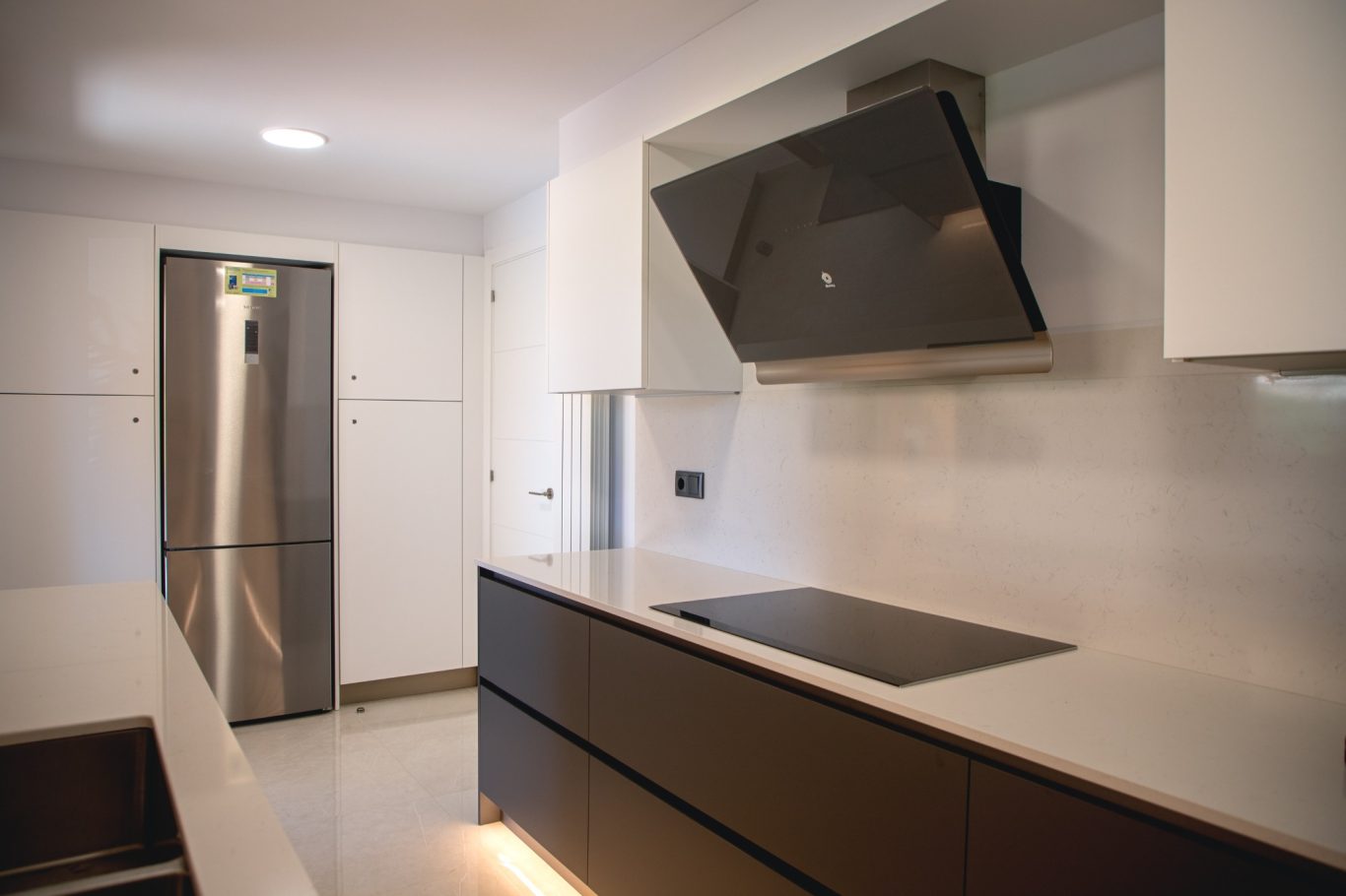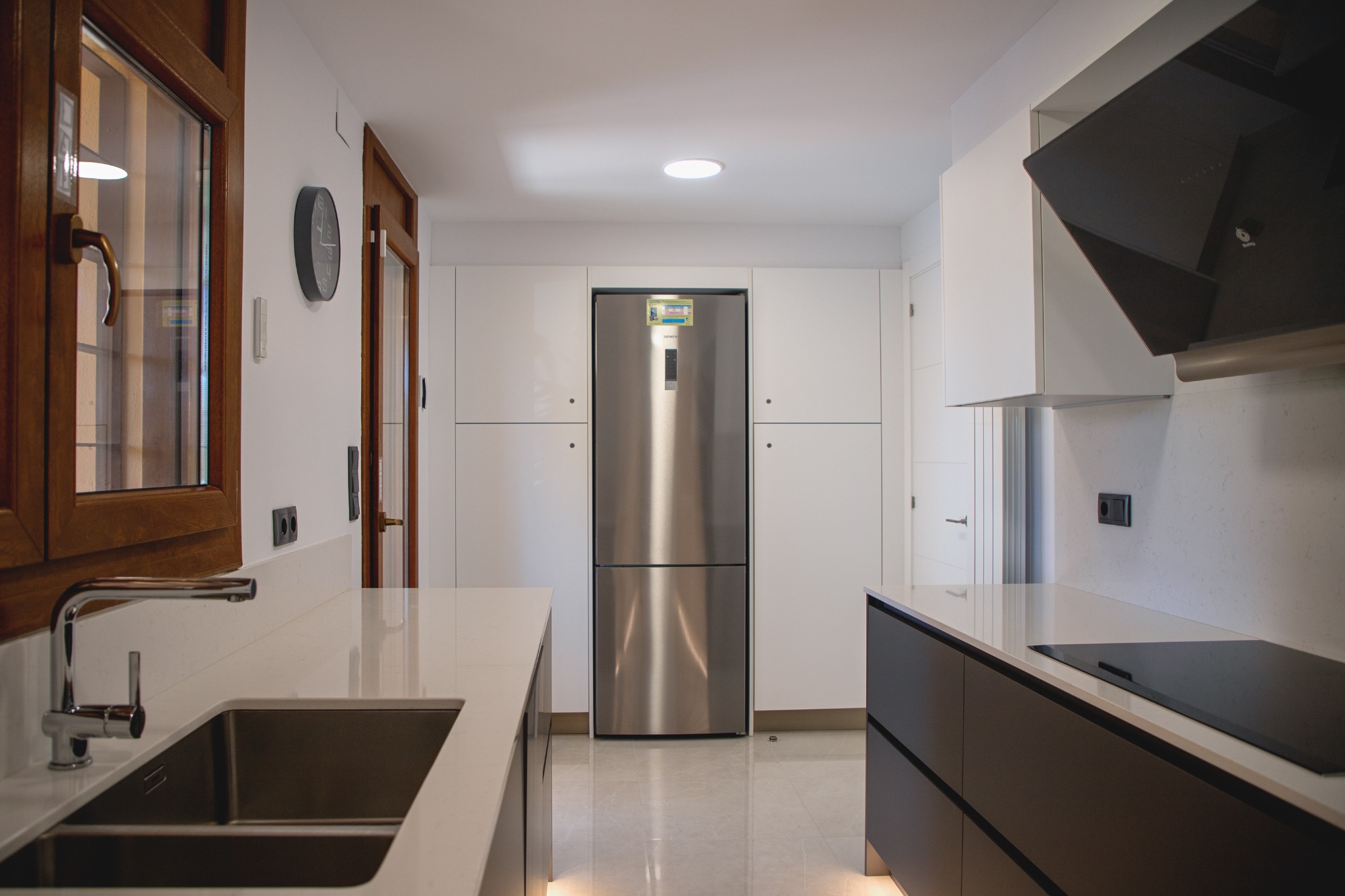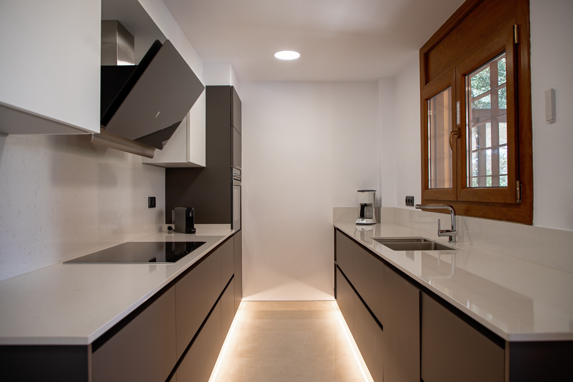 Die moderne Küche ist vollständig ausgestattet und bietet alles, was man für entspanntes Kochen im Urlaub benötigt: hochwertige Geräte, einen großen Kühl-/Gefrierschrank, viel Arbeitsfläche und umfangreiches Kücheninventar. Durch die Terrassentür gelangt man direkt zur Außenküche – ideal für BBQs und mediterrane Gerichte im Freien.