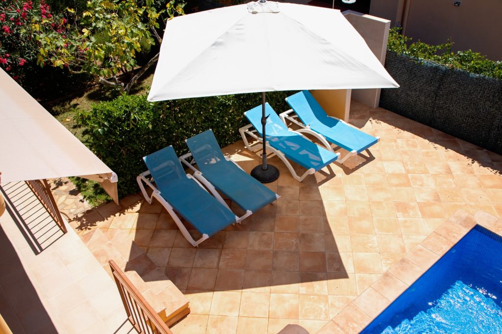 Der große Garten ist gepflegt angelegt und lädt mit Oliven und mediterranen Pflanzen zum Verweilen ein. Highlight ist der private Salzwasserpool, der angenehm erfrischt und sanft zur Haut ist – umgeben von Sonnenliegen und gemütlichen Sitzecken. Außerdem bietet die Außendusche eine perfekte Gelegenheit zum Abduschen nach einer Abkühlung im Pool.