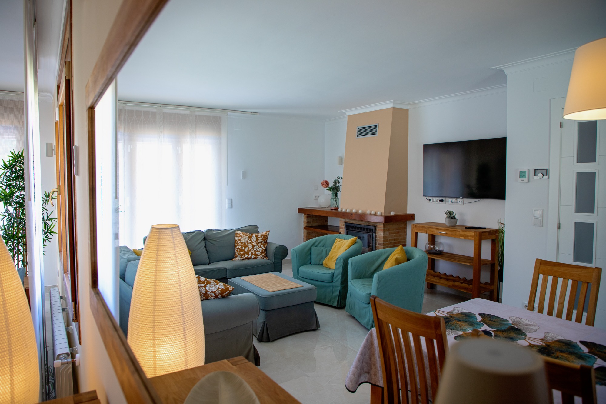 An kühleren Tagen sorgt der Kamin für eine gemütliche Stimmung. Ein Smart-TV, schnelles WLAN und ein durchdachtes Beleuchtungskonzept runden den Wohnkomfort ab.